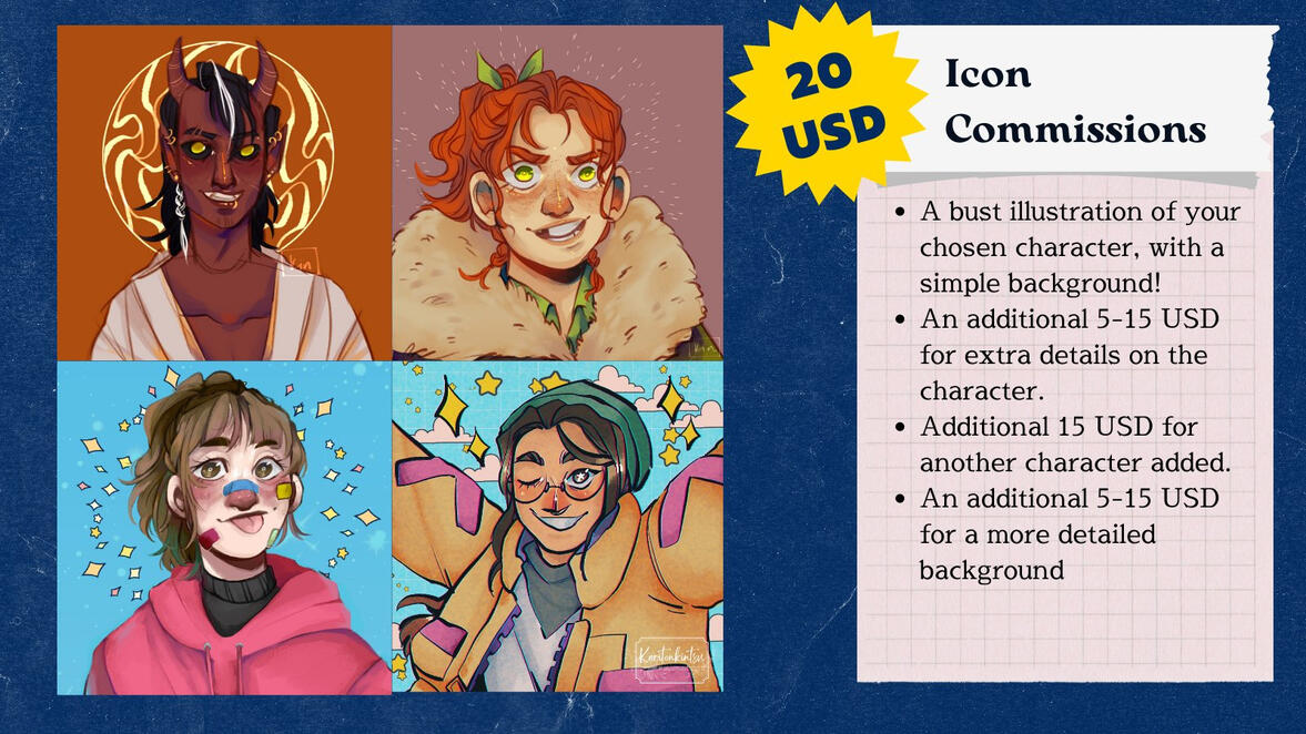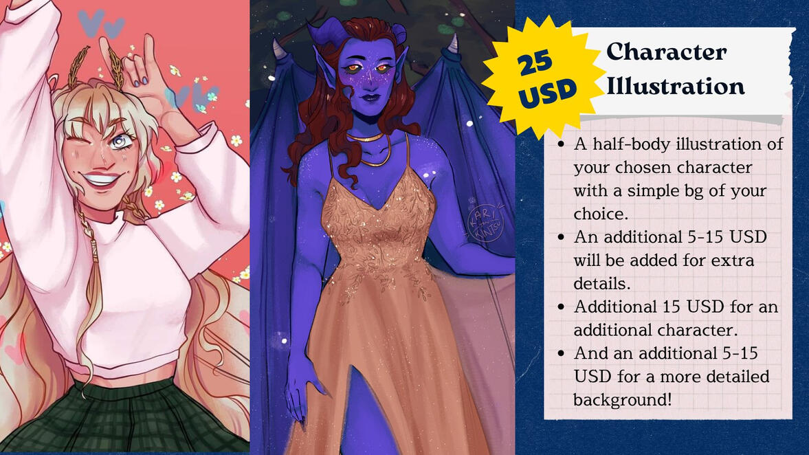 No Rush! A piece will take up to 1-2 weeks to finish, and depending on my availability (as I am still a student taking up my online classes and my thesis.) and the complexity of the artworks- Rushed commissions will cost extra.